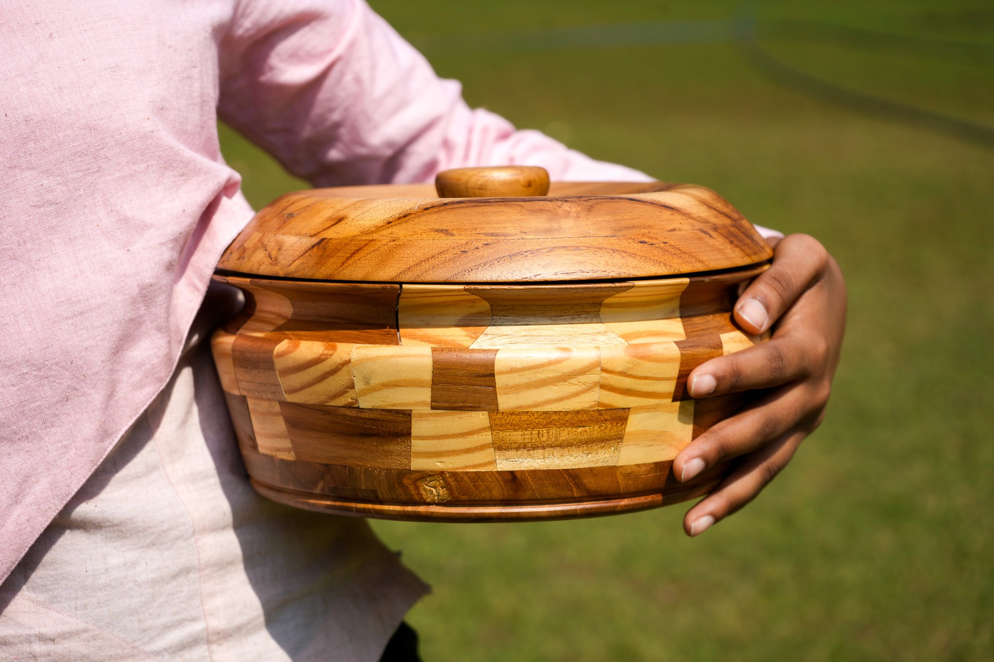 Crafted from laminated layers of Chillpine and Teak, this turned wooden bread vessel reveals a linear grain pattern shaped through rotational symmetry. The contrast in tone and texture emerges as the form evolves on the lathe, while a lacquer finish enhances durability and depth. The piece embodies material dialogue and refined everyday utility through traditional craft.